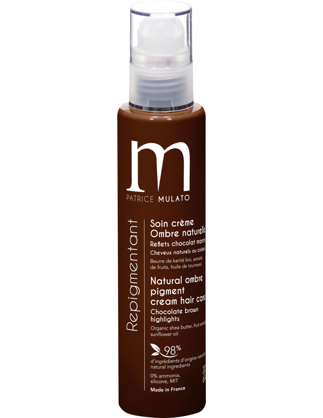 Mulato Repigmentant Ombre Naturelle : est un soin repigmentant composé à 98% d'ingrédients naturels, qui colore le cheveu de façon durable tout en préservant l'équilibre du cuir chevelu. Le soin est autant efficace sur cheveux naturels que sur cheveux déjà colorés ou méchés. Made in France
